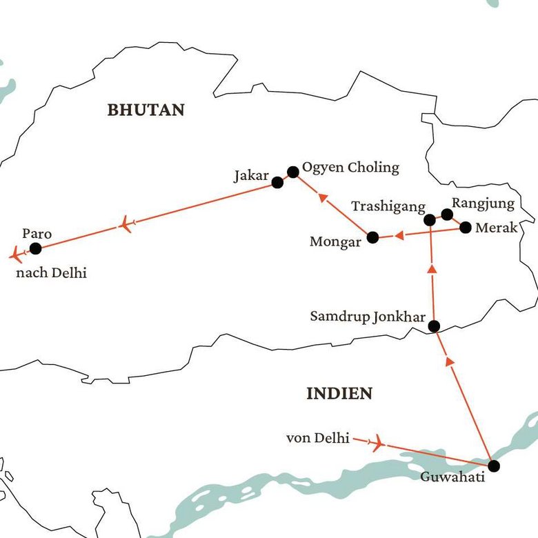 Wir nähern uns Bhutan von Osten, wo wir in den ersten Tagen die noch wenig besuchte Region des Landes erkunden. In Merak übernachten wir bei einer Brokpa-Familie und erhalten einen authentischen Einblick in ihr halbnomadisches Leben. In Ogyen Choling nehmen wir am dreitägigen Kangso-Ritual teil. Das berühmte Tigernest-Kloster rundet unsere Reise stimmungsvoll ab.