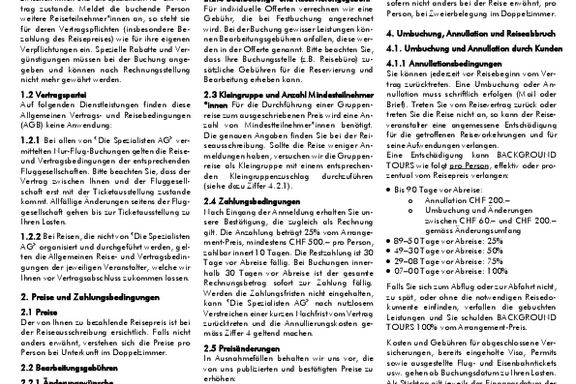 Allgemeine Vertrags- und Reisebedingungen (AGB) Wir freuen uns, dass Sie sich für eine Reise von «Die Spezialisten AG» interessieren und danken für Ihr Vertrauen. Mit der Entgegennahme und…